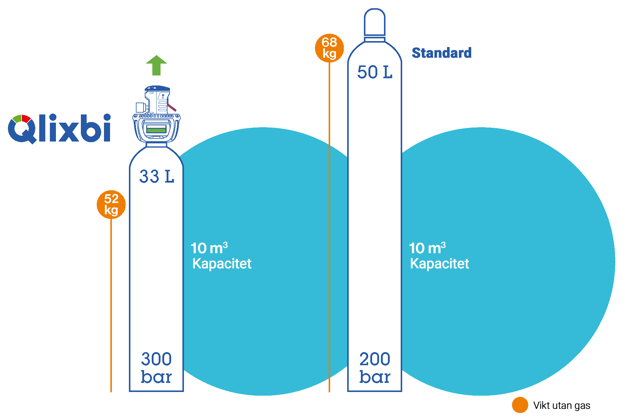 Vi rekommenderar definitivt Qlixbi i 33-litersflaskan med 300 bar. Den kompakta flaskan inklusive Qlixbi-connectorn väger endast 52 kg.
